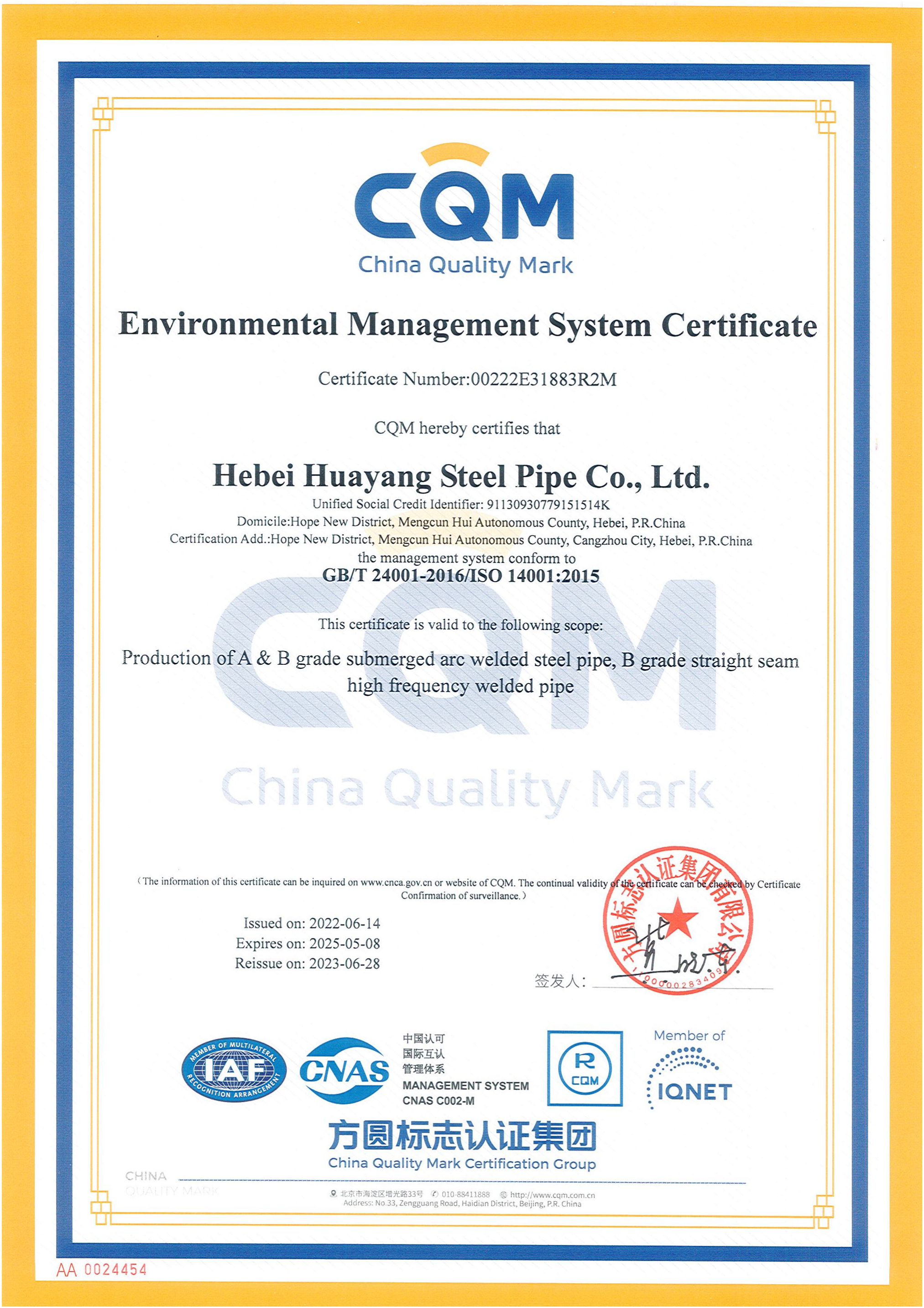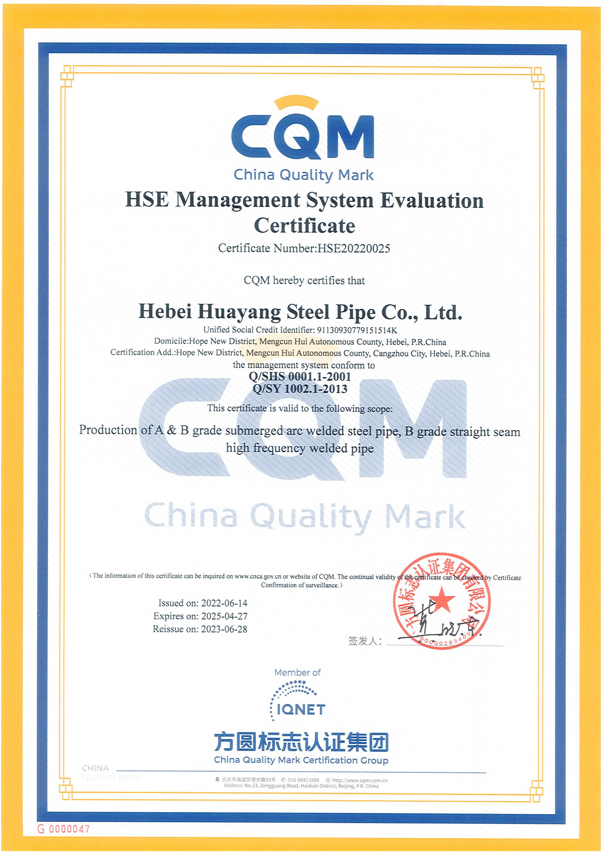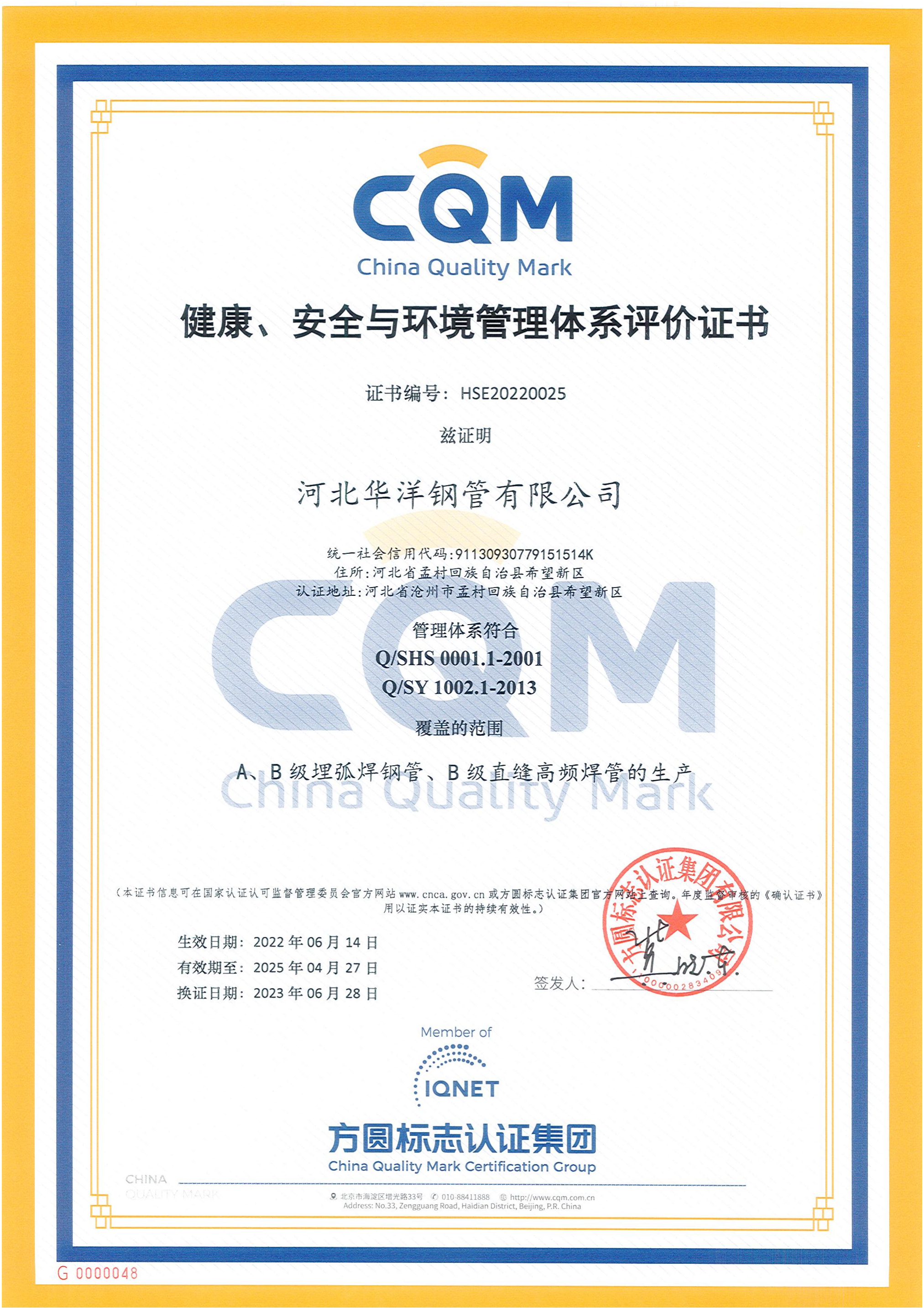 健康、安全與環(huán)境管理體系評價證書