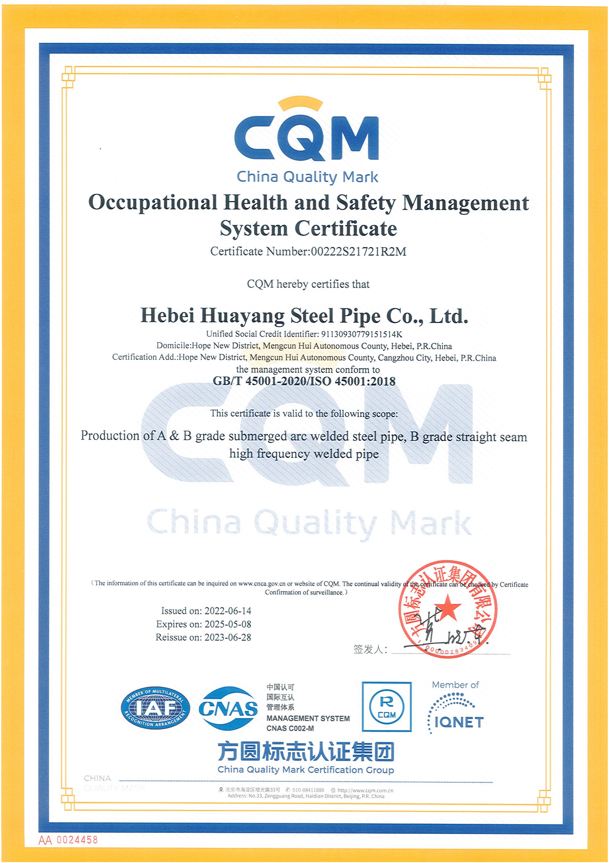 職業(yè)健康安全管理體系認證證書英文